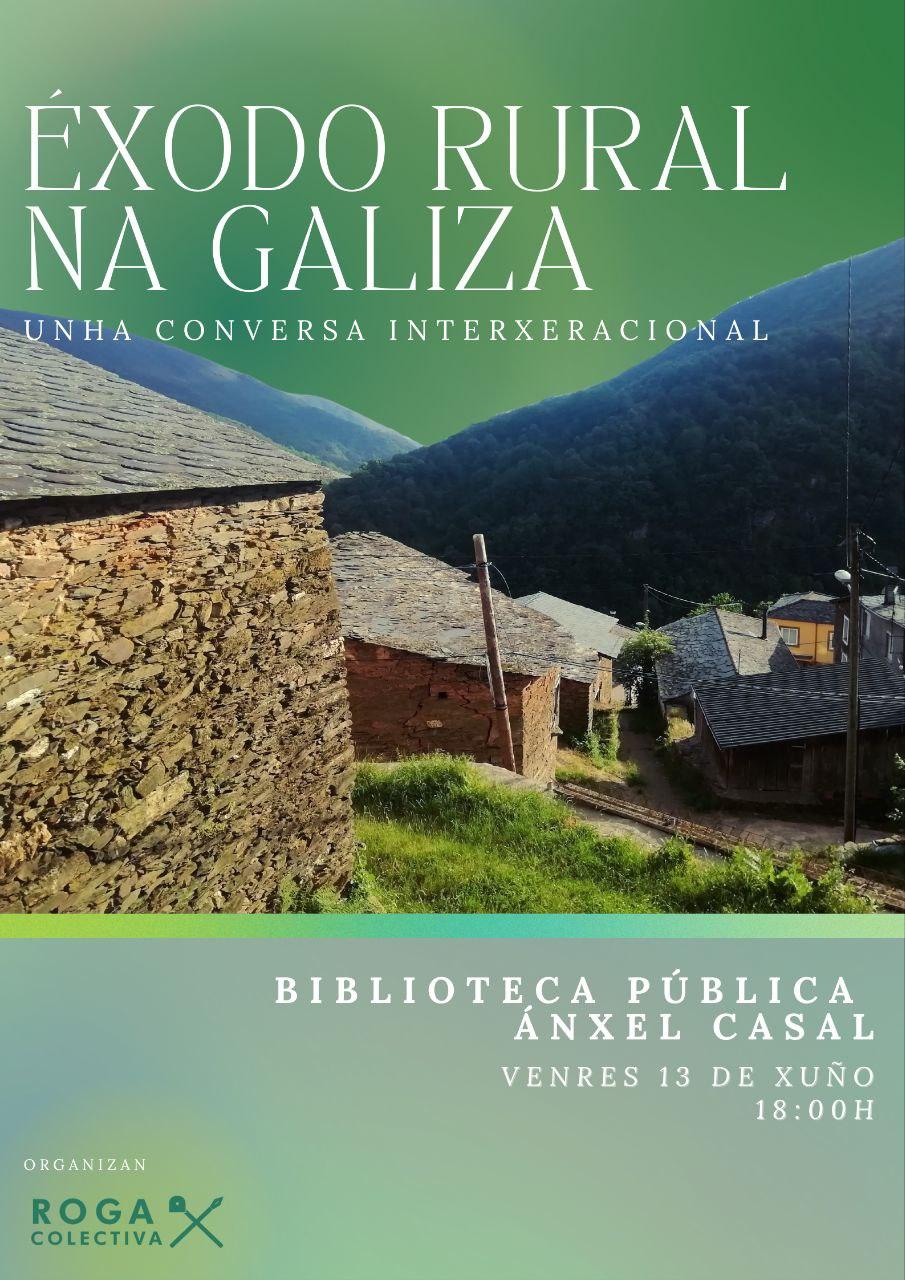 Cedemos el espacio a la Asociación ROGA Colectiva para realizar una jornada en la que se abordará el fenómeno del éxodo rural en Galicia desde diversas perspectivas, reconociendo también la relevancia y el impacto del mundo urbano en nuestras vidas. Comenzará con una charla informativa que analizará las causas, consecuencias y posibles soluciones a la migración del campo a la ciudad. A continuación, se abrirá un coloquio y debate en el que los asistentes podrán compartir sus experiencias personales como emigrantes o descendientes de emigrantes, enriqueciendo la discusión con testimonios directos sobre como sus vivencias moldean su percepción del entorno.